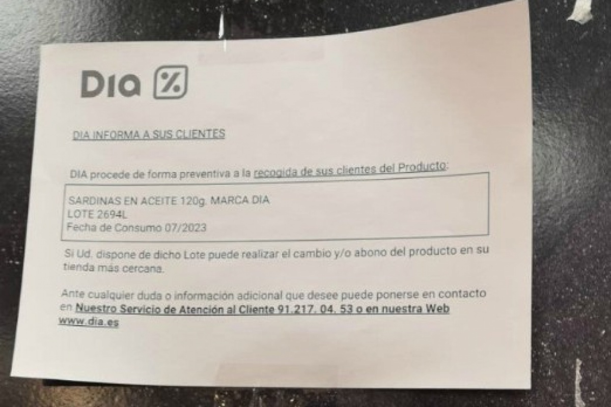 El pasado 28 de enero la La Agencia Española de Seguridad Alimentaria y Nutrición (AESAN) ha tenido conocimiento, a través de los puntos habituales de contacto de las comunidades autónomas, de que la empresa Grupo DIA “ha procedido a la retirada de un lote de 24.576 latas de sardinas en aceite de oliva en conserva marca DIA, fabricado por Cofisa, Conservas de Peixe de Figueira S. A, ante el posible defecto de esterilización de algunas de esas latas y únicamente como medida preventiva. En concreto el lote afectado es 2694L con caducidad en julio de 2023, que se distribuyó en diferentes establecimientos de la compañía en España y Portugal.”